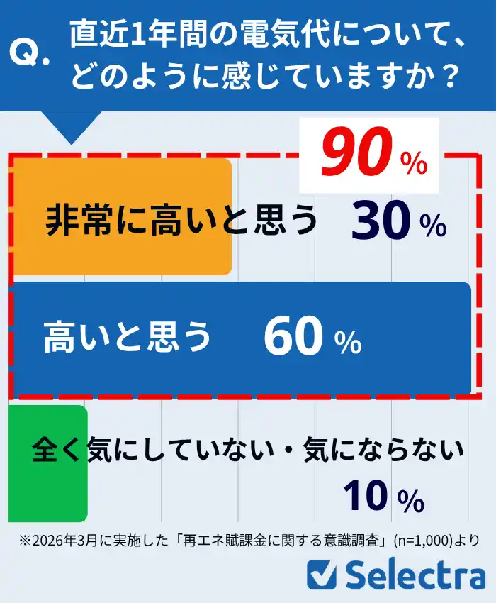 ここ最近の電気代に関しては、9割が「高いと感じている」と回答し、負担感の強さが非常に際立つ結果となりました。 |