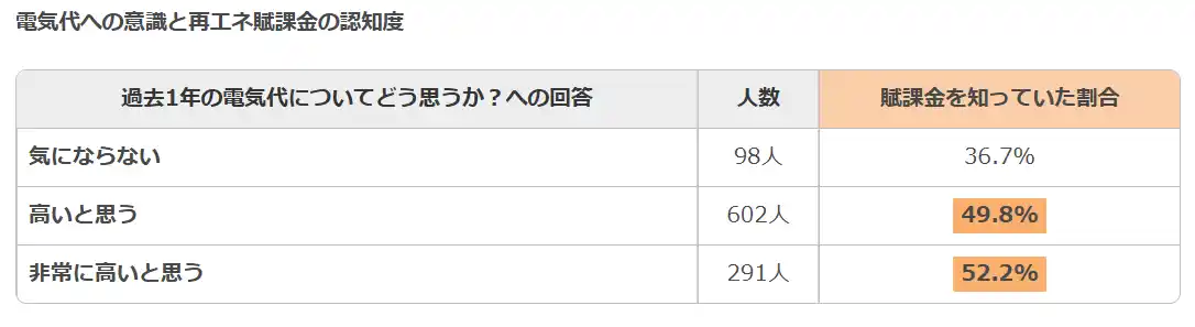 以下の表の通り、電気代への意識が高いほど、賦課金を知っている率が上がるという傾向が見られます。ただしこの差は緩やかで、「非常に高い」と感じている人でも約半数が知らないままです。「電気代が高い=再エネ賦課金を把握している」とはならないことが分かります。 |