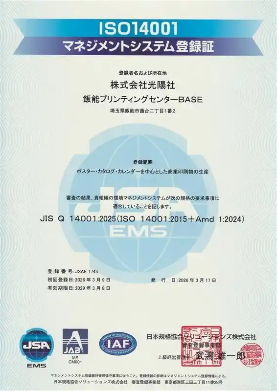 東京、大阪、名古屋を拠点に、高品質な商業印刷と環境配慮型プリントを展開する株式会社光陽社(本社:東京都文京区、代表:犬養 岬太、https://www.koyosha-inc.co.jp/)は、2026年3月、主力生産拠点である飯能プリンティングセンターBASEにおいて環境マネジメントシステムの国際規格「ISO14001:2015」の認証を取得いたしました。 |