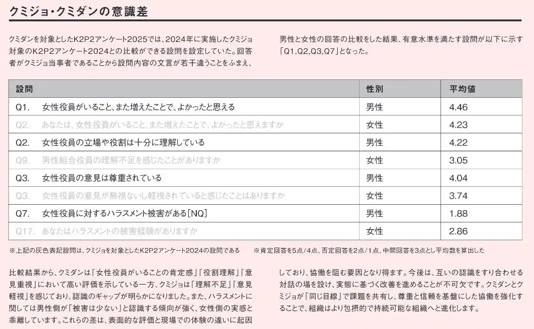 ジェンダー課題に対する認識のギャップ クミジョとクミダンの間で、クミジョのハラスメント被害や組織内の不公平感に対する認識に差が見られるなど、課題の捉え方にギャップが存在していることが明らかになりました。 |