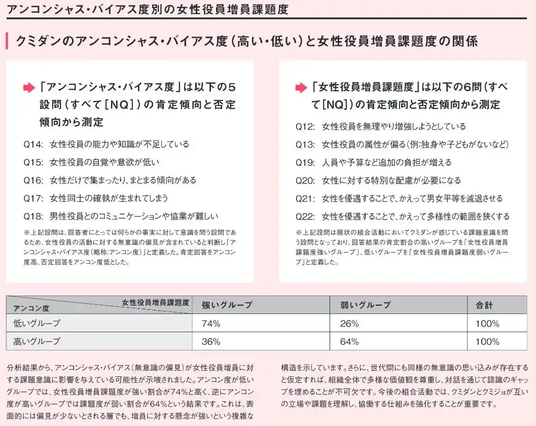 アンコンシャスバイアスが女性役員増員の課題意識に影響 クミダンのアンコンシャス・バイアスが、女性役員増員への影響を及ぼしている可能性が示唆されました。アンコンシャス・バイアス度(以下、アンコン度)の高低でグループ化すると、アンコン度の高いグループは女性役員増員への課題意識が74%と高く、低いグループは36%と最大で約2倍の差がつく結果となりました。 |