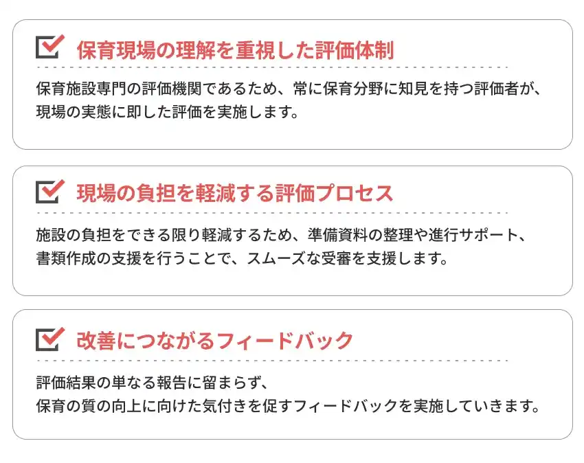保育第三者評価株式会社では、施設に寄り添った第三者評価を提供をしています。これらの特徴により、施設が「受けてよかった」と感じられる第三者評価を目指しています。 |