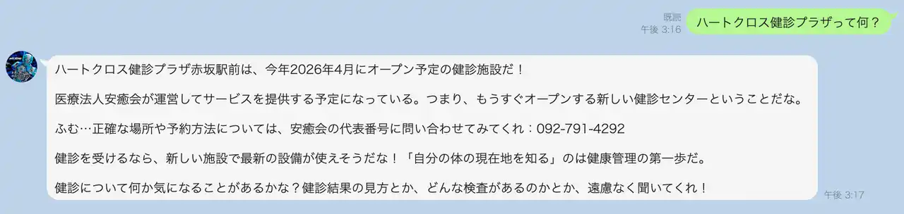 株式会社THA(本社:東京都新宿区、代表取締役:西山朝子)は、医療法人安癒会(本社:福岡県福岡市、会長CEO:大賀崇浩)が2026年4月に開設する「ハートクロス健診プラザ赤坂駅前」と連携し、健診受診者の行動変容を目的とした対話型AI「AIオーガマンアンチエイジング」をAI社長の技術を用いて共同開発したことをお知らせします。