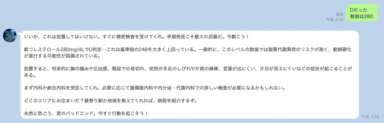 「AIオーガマンアンチエイジング」は、健診で異常値が出ても「自分は大丈夫」と放置してしまう健診受診者に対し、リスクをわかりやすく伝え、受診を後押しする伴走型のAIサービスです。薬剤戦師「オーガマン」が、24時間いつでも相談に応じます。