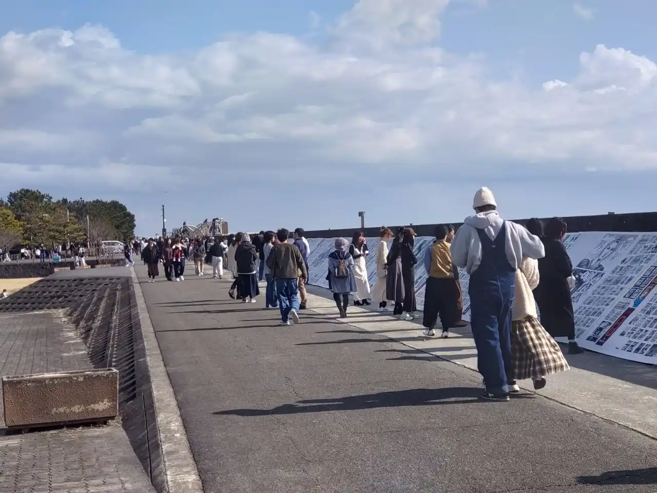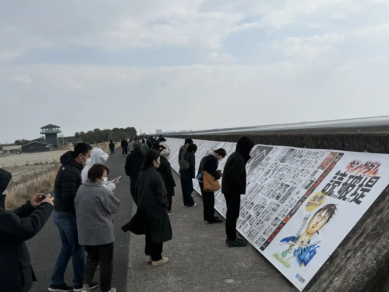 有明海沿いの防波堤に、コミックス1巻から77巻までの全ページを掲出。その長さは全長300mを超える、前代未聞の無料公開。 |