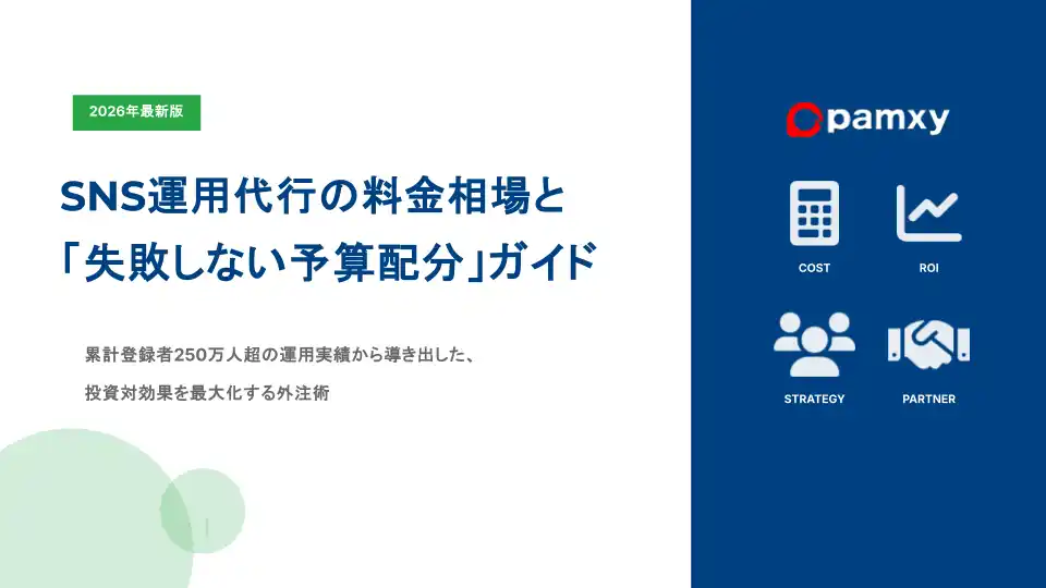 SNSマーケティング支援を展開する株式会社pamxy(本社:東京都港区、代表取締役:西江 健司)は、企業の予算設計の失敗を防ぎ、投資対効果(ROI)を最大化させるための最新資料『SNS運用代行の料金相場と「失敗しない予算配分」ガイド』を公開いたしました。 |