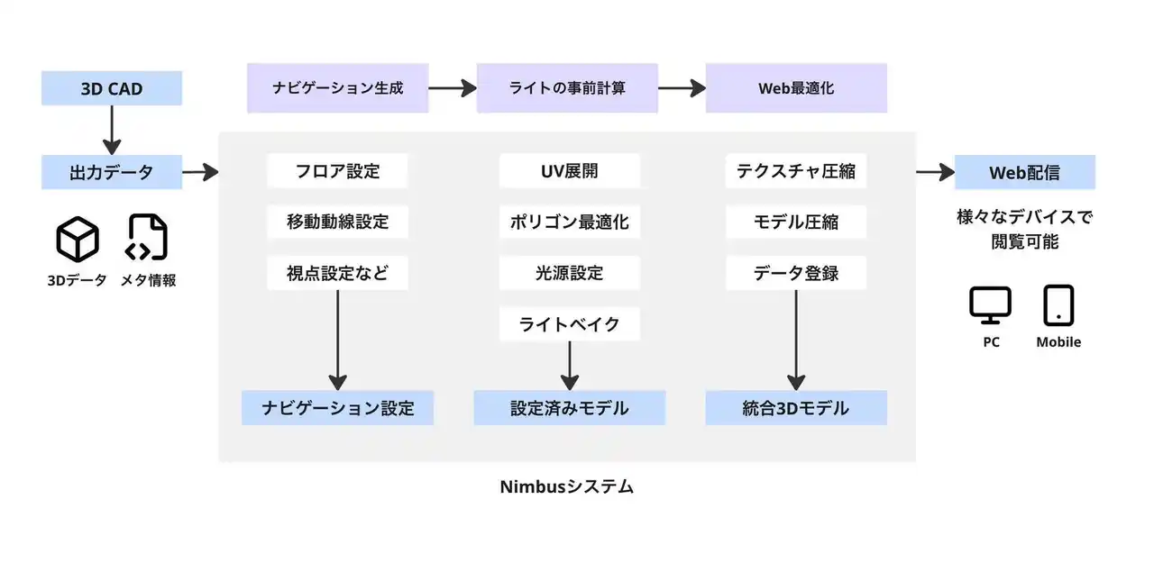 本技術は、技術者が手作業で行っていたVR化工程を、CADメタデータの解析によってシステム化したものです。独自システム「Nimbus(ニンバス)」により、制作工程の自律化と省人化を推進。人的ボトルネックを排除したことで、クラウドによる並列処理を可能にし、「全棟VR化」を支える空間のデジタルインフラ構築を加速させます。 |