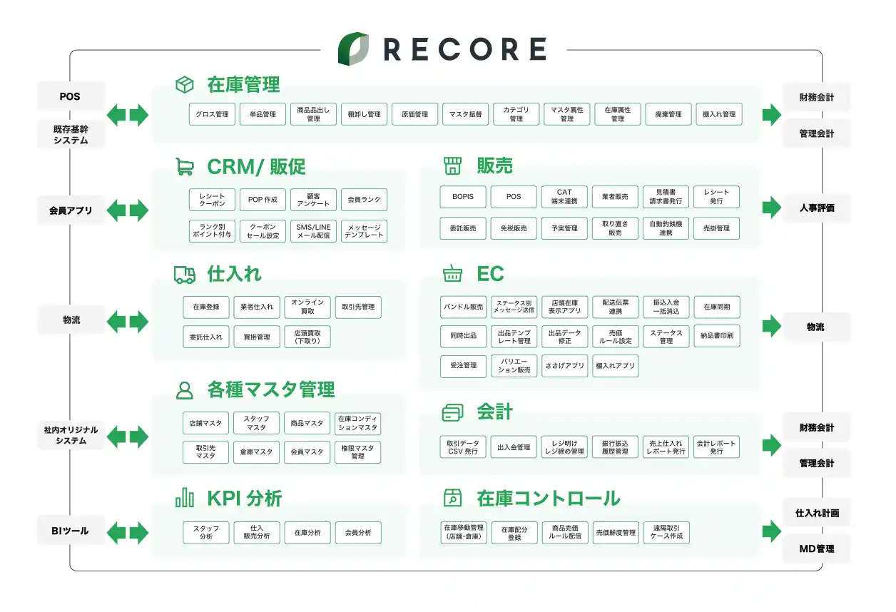 | RECORE(リコア)は、小売・リユース業界に特化したクラウド基幹システムです。POS、在庫、顧客管理、EC連携、免税販売、BOPIS、会員ランクなど、オムニチャネルを前提とした統合機能を標準搭載。リリースから6年で、400社1,300店舗を超える小売・リユース事業者が利用中。 | |||
