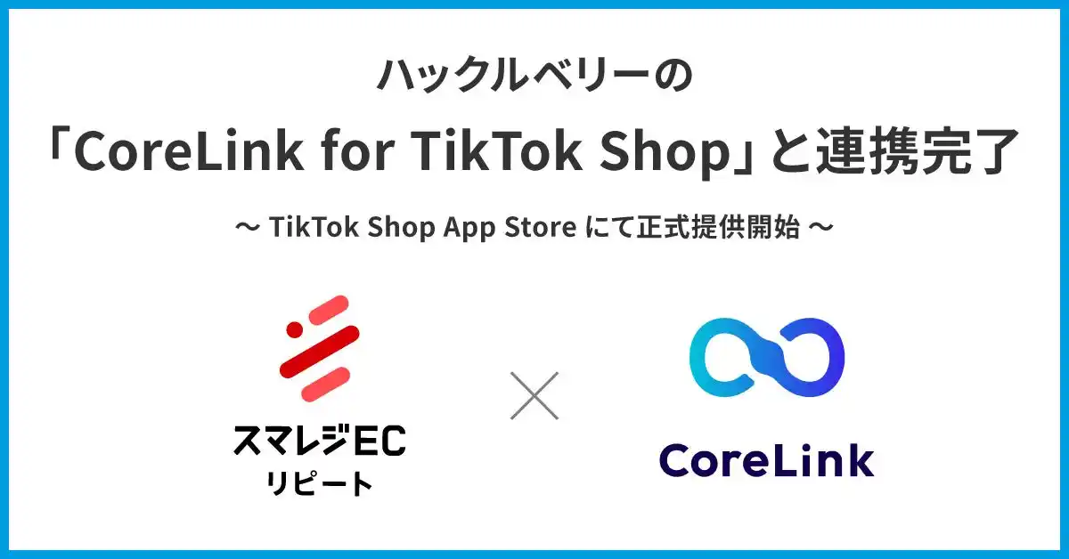 | 株式会社ネットショップ支援室(東京都港区、代表取締役 竹澤 洋一、以下ネットショップ支援室)が提供する、「スマレジEC・リピート」は、株式会社ハックルベリー(東京都世田谷区、代表取締役社長:安藤 祐輔、以下「ハックルベリー」)が提供する、TikTok Shop連携専用コネクタ「CoreLink for TikTok Shop」と連携完了したことをお知らせします。これにより、「スマレジEC・リピート」をご利用のEC事業者様はCoreLink for TikTok Shopを使用することで商品、在庫、受注、キャンセル情報を、TikTok Shopへ連携することが可能となります。 | ||||||||||||