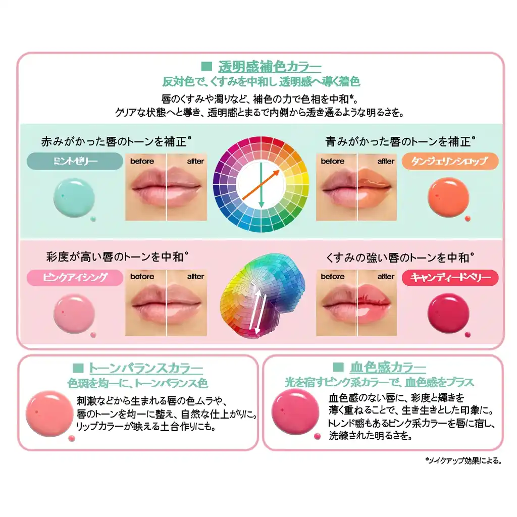 | 唇のくすみや濁りなど、補色の力で色相を中和*。 | |||||||||||||||||||