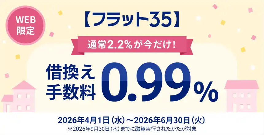 キャンペーン期間中に、当社WEBサイトまたはアプリから【フラット35】借換え(買取型限定)の事前審査をお申込みいただき、お借入れいただいたかたを対象に、通常「お借入れ金額の2.2%(税込)」となる事務取扱手数料を「0.99%(税込)」に引き下げます。 |