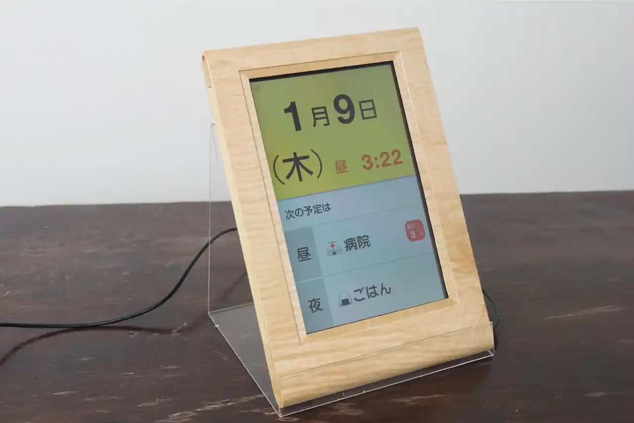 2014年の研究時の試作品。当時はタブレット端末が珍しかったため、日常生活に溶け込むよう木枠を取り付けていた。 |