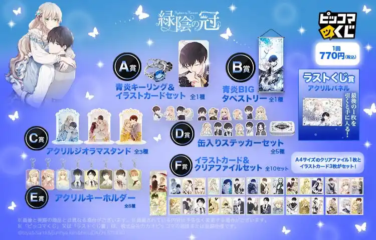 | A賞とB賞には、ラチア公爵家を象徴する「青炎」をモチーフにした重厚なキーリング&イラストカードセットやタペストリーを。ランとユスタフの甘い名シーンを再現したアクリルジオラマスタンドなど、たくさんの思い出が蘇るイラストアイテムもぜひお手元にお迎えください。 | ||||||||||||||