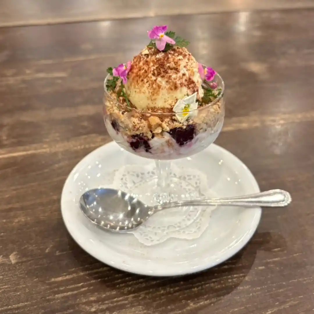 フローズンヨーグルト、バニラアイス、ベリーソース、ナッツの塩クランブルを使用して、土、木の実、お花が豊かな大地をイメージしています |