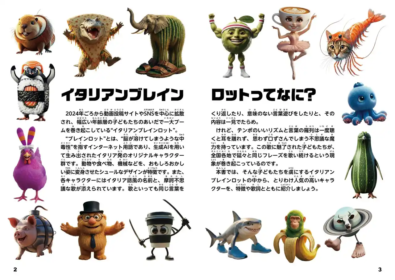 『イタリアンブレインロット』といえば、一度聴いたら耳から離れないあの中毒性のある歌です。本書ではキャラクター紹介だけでなく、みんなが口ずさんでいる歌の歌詞も掲載しています。本を見ながら一緒に歌って、親子の時間をより深く楽しむことができます 。 |