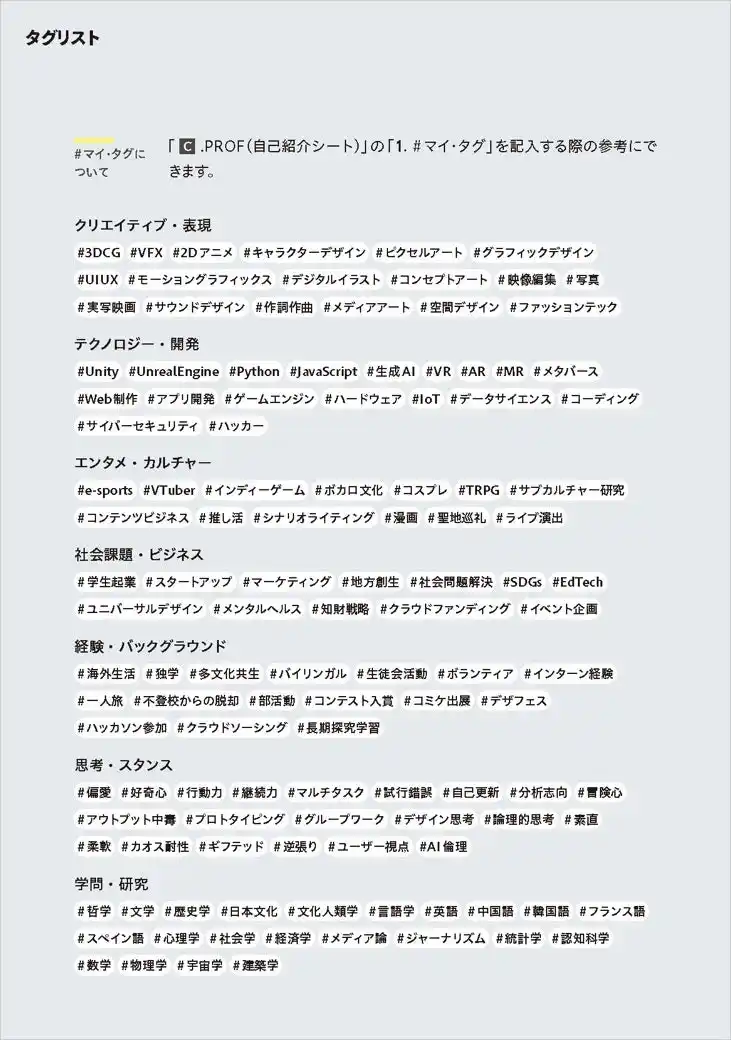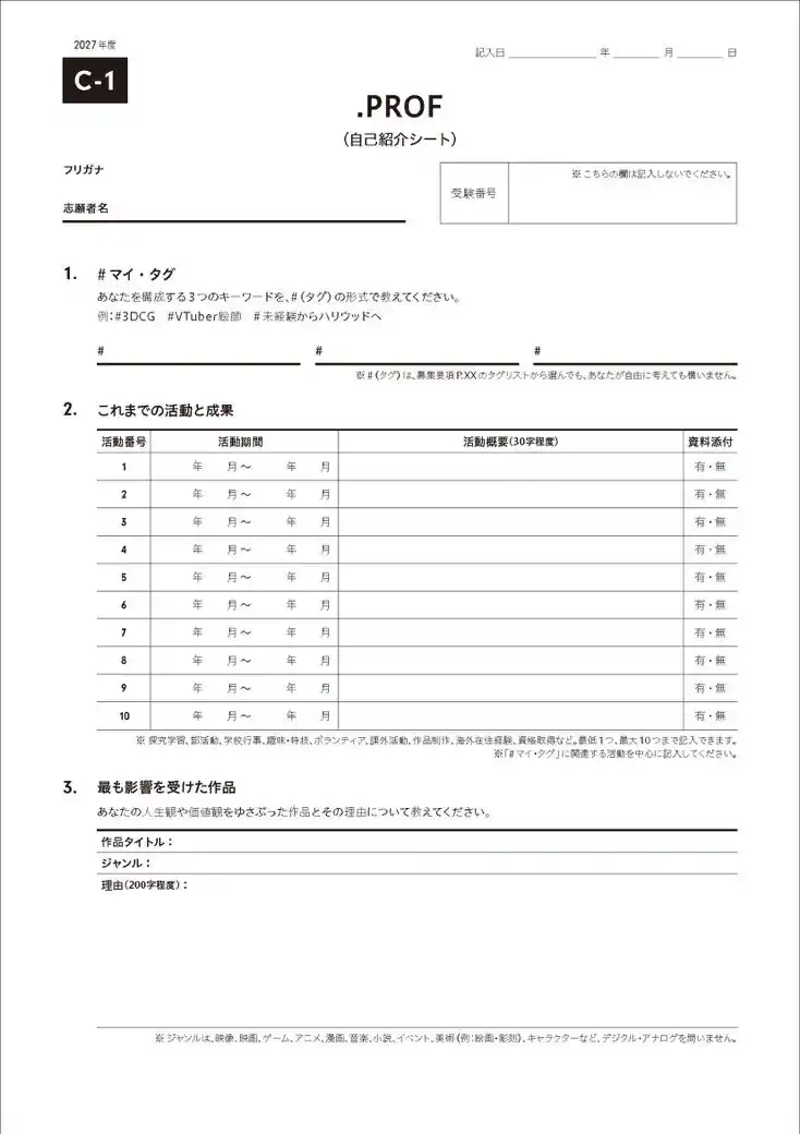 これに伴い、「志望理由書」や「活動記録報告書」などの本学書式を見直します。#マイ・タグをはじめ、受験生の偏愛の履歴を記載するための書類として、「PROF.(自己紹介シート)」を導入します。PROF.には、#マイ・タグとそのタグをつけるに至るまでの活動についての記録、最も影響を受けた作品とその理由、入学後のビジョンについて記入欄を設けました。 |