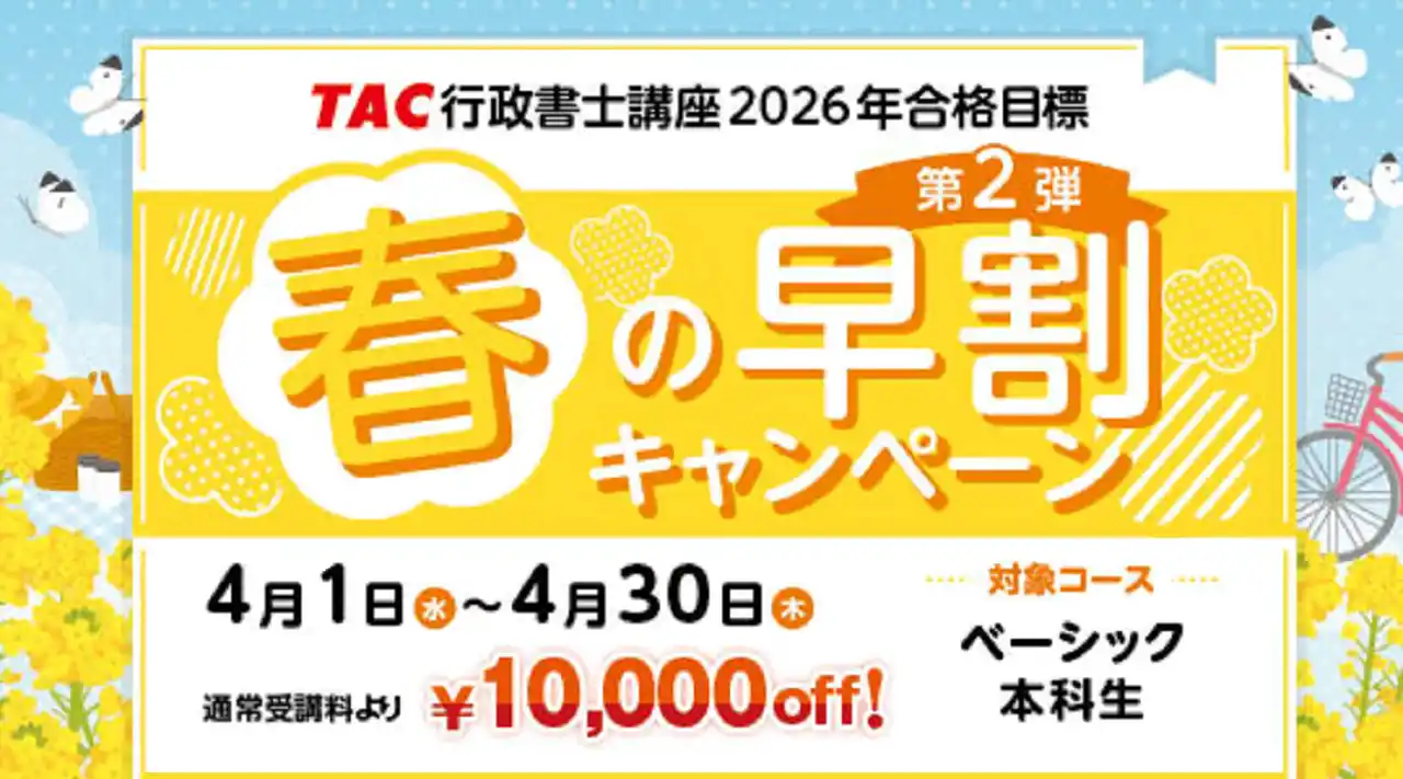 行政書士試験対策講座を展開しているTAC株式会社(東京都千代田区)は、2026年合格目標で春から学習スタートするコース『ベーシック本科生』を4月より全国TAC校舎で開講します。また、初学者の方もオトクに始められる『春の早割キャンペーン第2弾』を4/1(水)~4/30(木)で実施します。 |