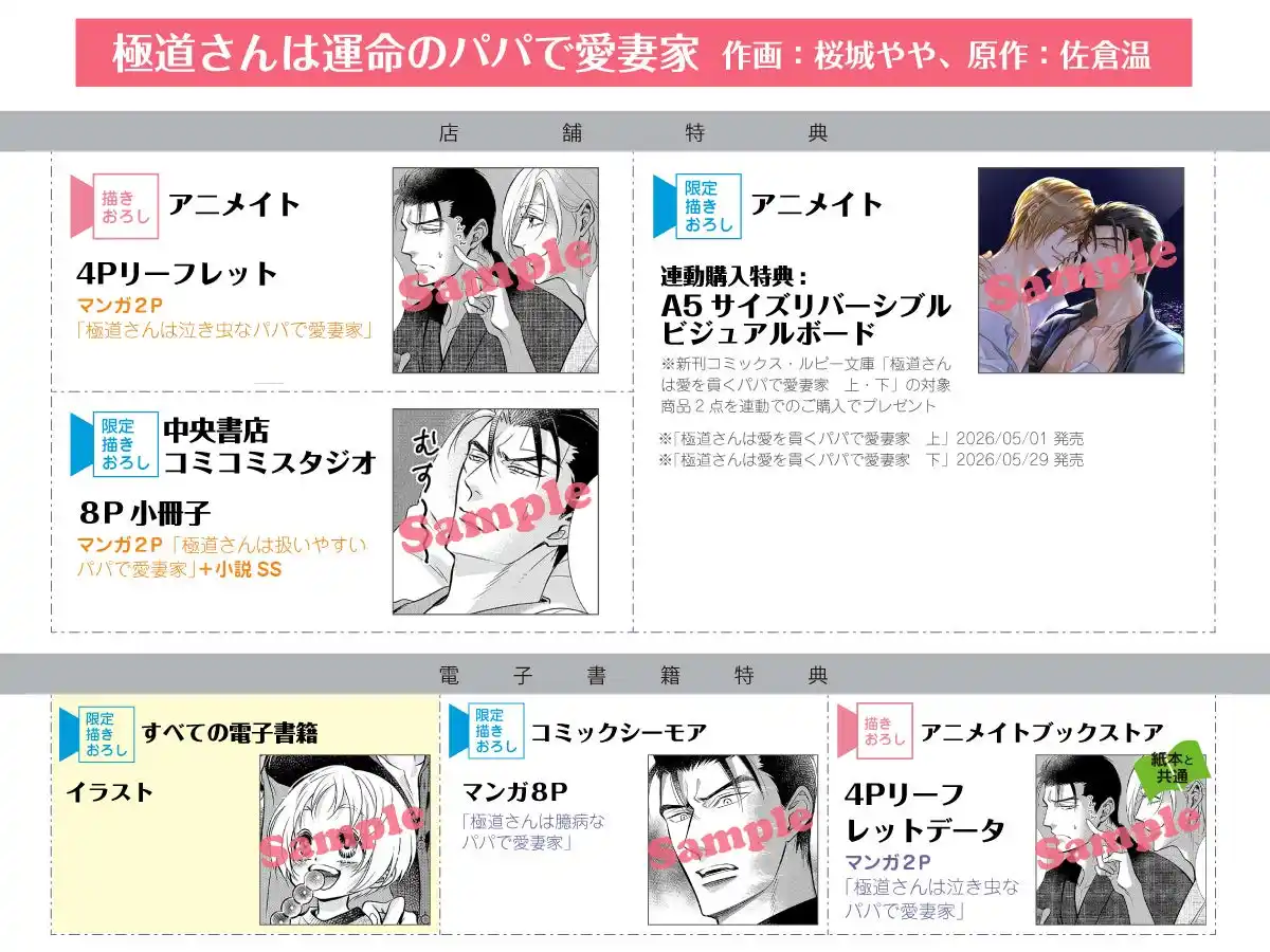 | 原作小説『極道さんはパパで愛妻家』(ルビー文庫刊)が2016年に刊行開始してから今年10周年となるのを記念し、アニメイトにて著者の佐倉温先生と挿絵・コミカライズの作画を担当する桜城やや先生のサイン会を行います。 | |||||