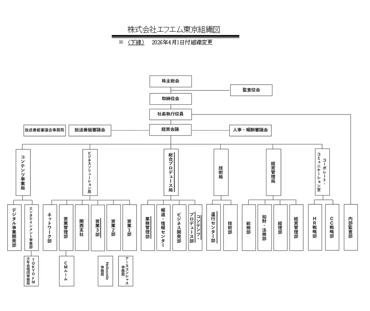 | 株式会社エフエム東京(本社:千代田区麹町 代表取締役社長執行役員:唐島夏生)は、2026年4月1日付にて、下記のとおり組織変更および人事異動を決定いたしましたので、お知らせいたします。 | |||||||||