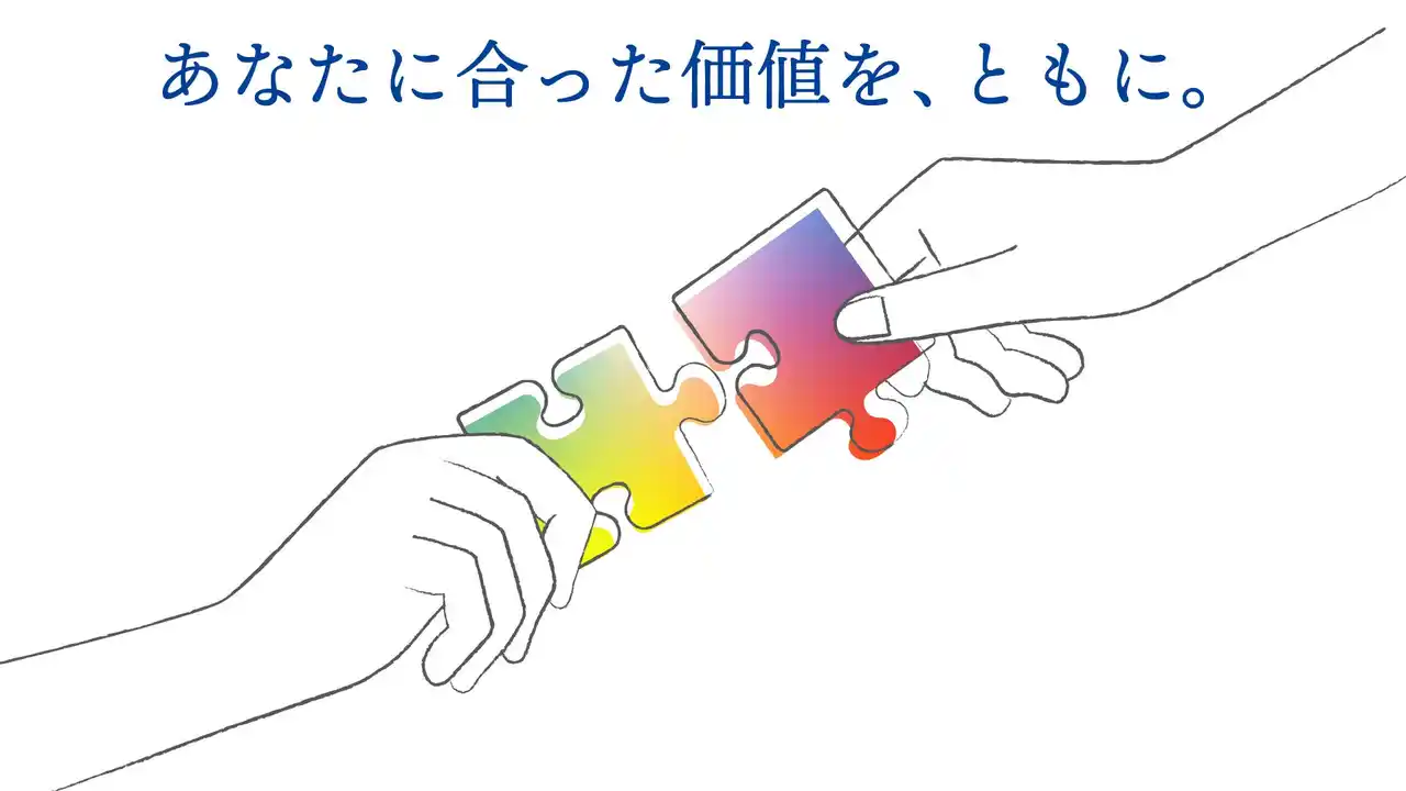 ブランドコンセプトと併せて制作したキービジュアルでは、それぞれ違う色や形を持っているステークホルダーの皆さまに対して、あなたに合った価値をともに創るという意志を、多様性の象徴であるレインボーカラーのパズルピースと左右の手で表現しています。 |