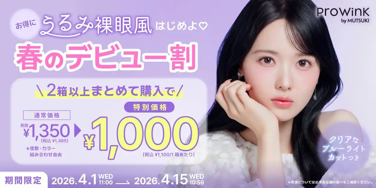 PIA株式会社(本社:東京都品川区 代表取締役:見原 博道)は、メイクアップアーティストの夢月さんプロデュース・松本ももなさん(高嶺のなでしこ)がイメージモデルを務めるカラコンブランド『ProWink(プロウィンク)』より、2026年4月1日(水)~4月15日(水)の期間、2箱以上同時購入で1箱あたり1,000円(税抜)で購入できるキャンペーンを実施いたします。 |
