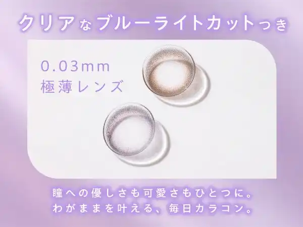 従来のブルーライトカットレンズは黄みを帯びているものが主流でしたが、無色透明レンズでブルーライトもUVもカットでき、さらに国内ワンデーで最薄の0.03mm極薄レンズでまるで裸眼のような快適なつけ心地というハイスペックさ。 |
