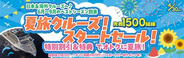 本セールは、旅行のベストシーズンの夏を、クルーズでお得に楽しんでいただくための期間限定キャンペーンです。人気の出発日や客室タイプは早期に満室となる可能性があるため、お早めのご予約をおすすめいたします。