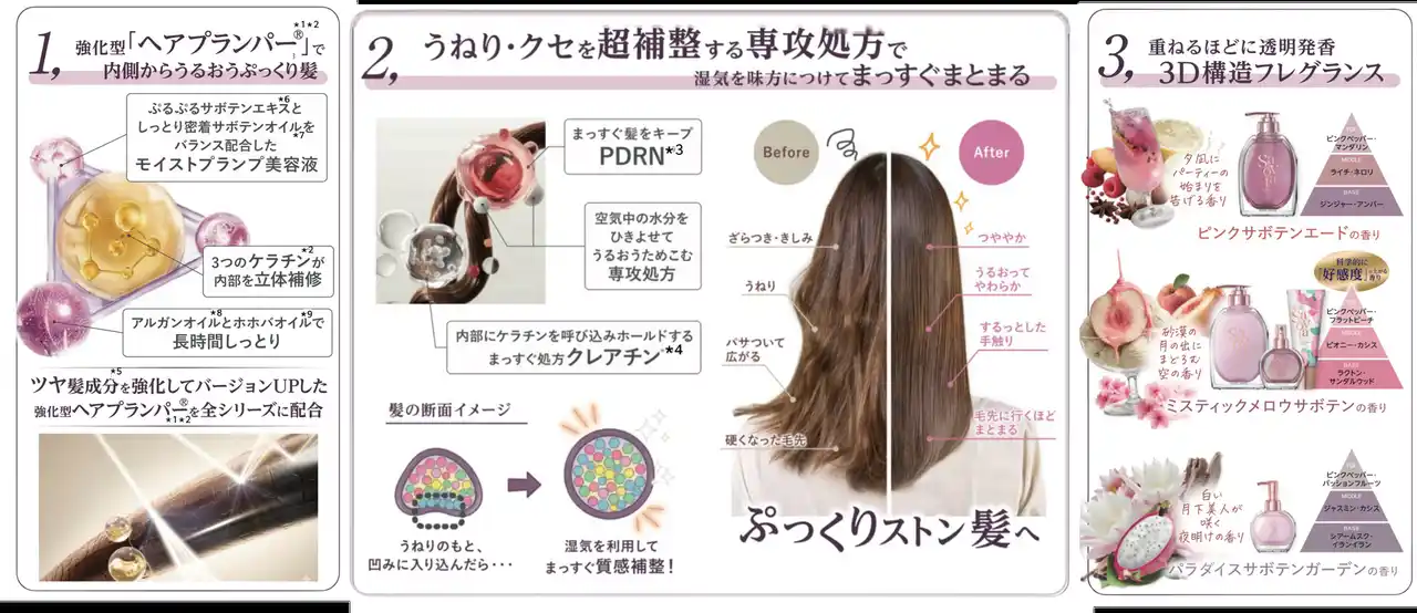 ヘアプランパー(R)*¹*²のツヤ髪成分を強化して、乾燥でも湿度100%でも、いつでもぷっくり髪! |