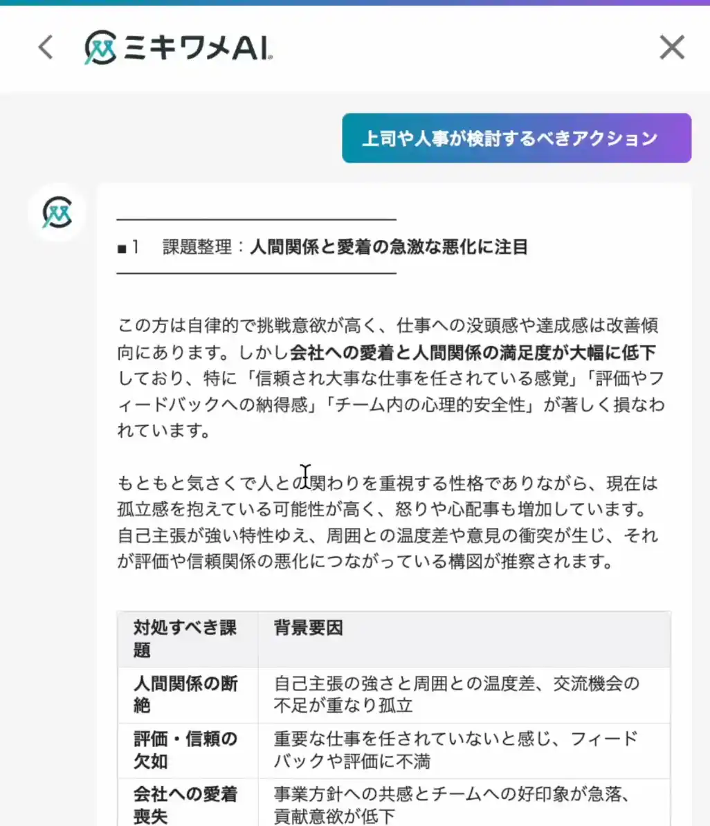 | 私たちは日々お客様と向き合う中で「測るだけでは、人は変わらない」ということを学びました。だからこそ「ミキワメAI」は、社員一人ひとりの性格特性とコンディションを可視化するだけでなく、具体的な行動指針をAIが提示する、導くプロダクトへと進化してきました。 | |||||||||