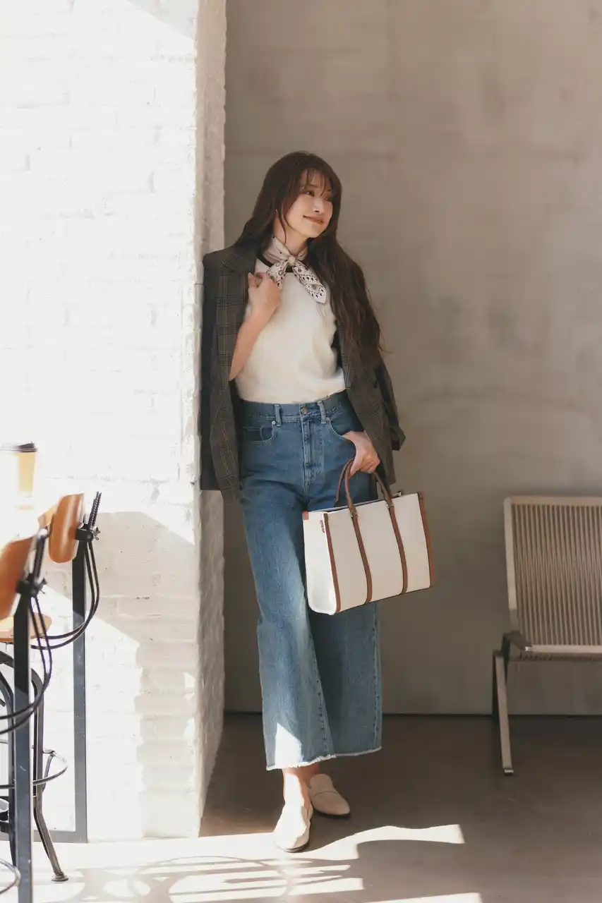 キャンバスのトートバッグはかっちりとしたスクエア型。異素材コンビでラフさもありつつきれいめな仕上がり。ブラウンの配色が堅くなりすぎず、程よく知的な雰囲気。スカーフやメガネでアクセントを加えても。 |
