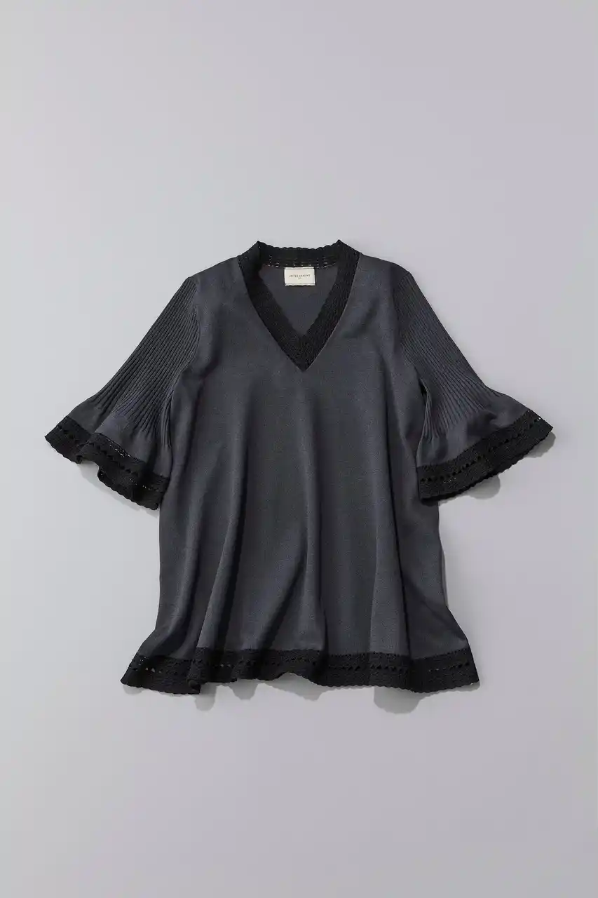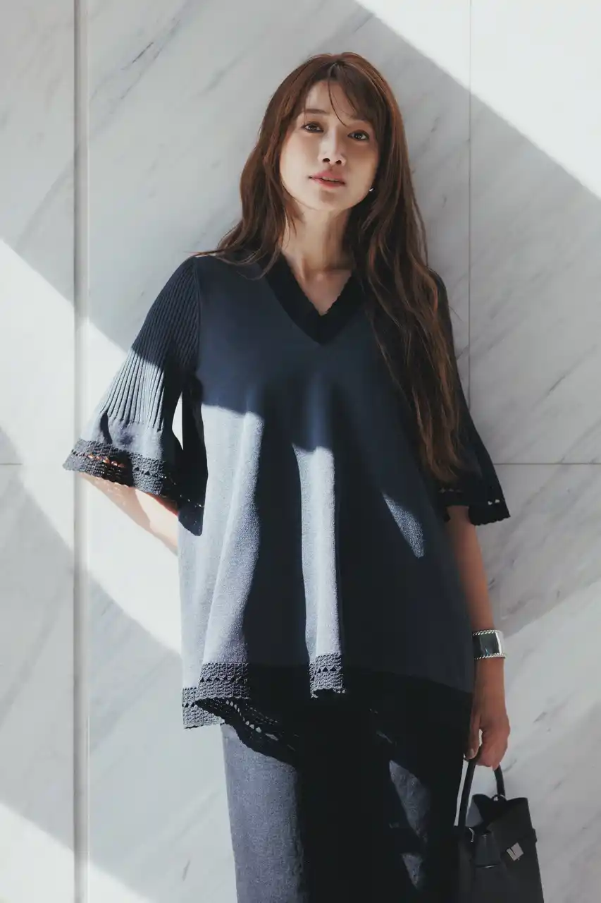 袖口や裾、首元にあしらった鈎針風の編地が美しいニットチュニック。程よく開いたVネックがデコルテを美しく、すっきりと見せてくれます。リサイクルポリエステル素材を使用し、軽さとスポンディッシュなタッチが特徴です。 |