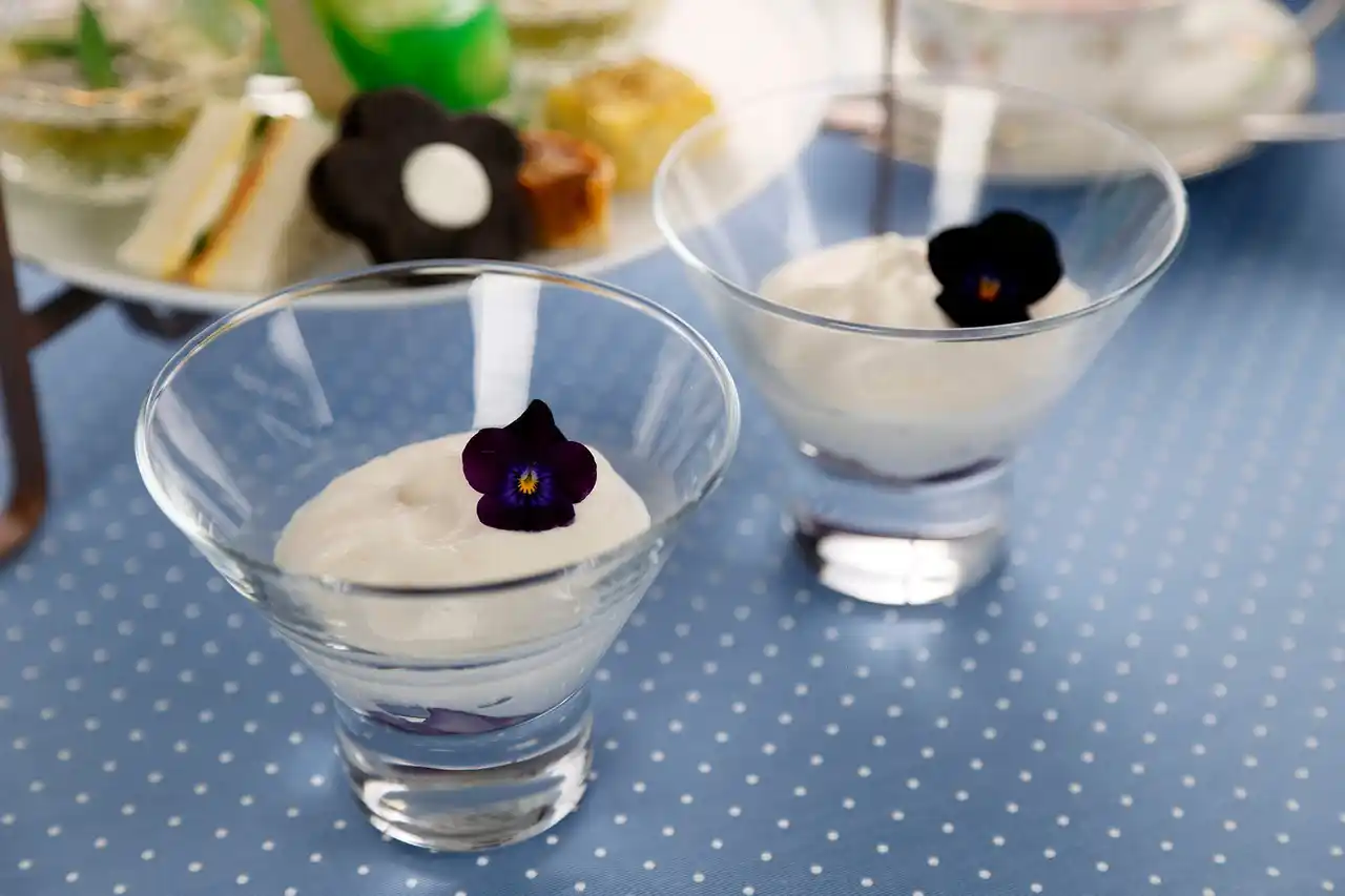 | はじめにお愉しみいただくウェルカムスイーツ「薔薇の香るギリシャヨーグルトのエスプーマ ライチのソルベ」は、薔薇とライチの華やかさを纏った軽やかなテイスト。ウェルカムドリンクには、英国で初夏を告げる花として親しまれるエルダーフラワーの爽やかな甘みを生かした一杯をご用意。お客様ご自身で水色のシロップを注いでいただくことで、天空のホテルから望む青空を映し出したかのような演出もお楽しみいただけます。 | |||||||||||