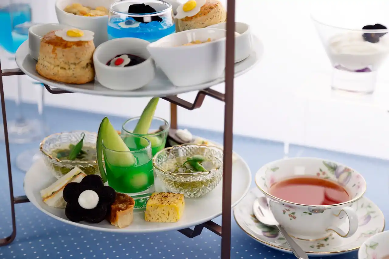 | セイボリーには、「サーモンときゅうりのサンドウィッチ」や「ライム香るメロンスープ」など、英国のアフタヌーンティーを象徴する定番に初夏のエッセンスを添えたラインナップをご用意。デセールには、「ダージリンティーのムース」や「バタフライピージュレとパンナコッタ」など、水色をまとったスイーツが優雅に並びます。さらに、マリークワントのアイコンをモチーフにした「ヴァローナショコラのクッキーサンド」など、見ているだけで心が弾む愛らしいデザインが、甘くときめく特別なひとときを演出します。 | |||||||||||