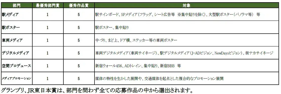 | 2025 年4 月1 日から2026 年3 月31 日の間に、当社が販売・管理する「JR東日本」「つくばエクスプレス」「ゆりかもめ」「りんかい線」「JR貨物」「しなの鉄道」「東京モノレール」の駅および車両のメディアならびに「街ナカサイネージ」に掲出・放映された広告作品を対象とします。 | |||