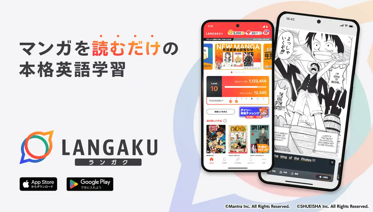 【人気マンガ×英語学習アプリ】 『Langaku』は、英語多読による濃密な学習体験をマンガで実現するアプリです。 『ONE PIECE』『鬼滅の刃』など、90作品以上の人気マンガを英語で楽しみながら、自然と英語力が身につきます。 |