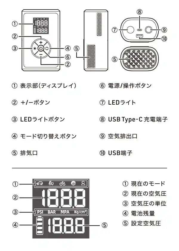 その他機能:オートストップ機能、空気圧モニタリング機能、バッテリー残量表示機能 |