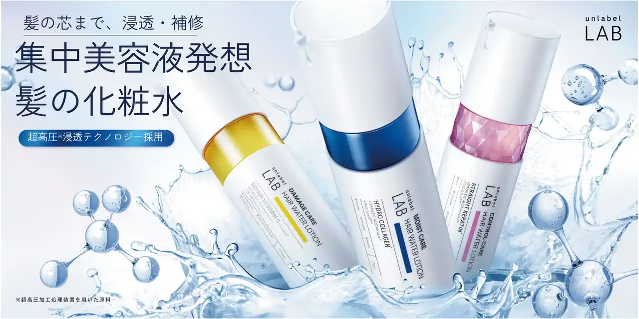 JPSLAB株式会社(ジェイピーエスラボ)(東京都港区、取締役社長:永井 博)は、超高圧※浸透テクノロジーを採用した「アンレーベル ラボ ヘアケアシリーズ」より、洗い流さないタイプのヘアウォーターローション3種(ダメージケア/モイストケア/コントロールケア)を、2026年4月1日(水)より順次展開いたします。べたつかず髪全体になじみやすい“髪の化粧水”として、ドライヤー速乾はもちろん、朝の寝ぐせ直しやスタイリング前、乾いた髪にも使用可能。髪の悩みに寄り添う集中ケアを提案します。 |