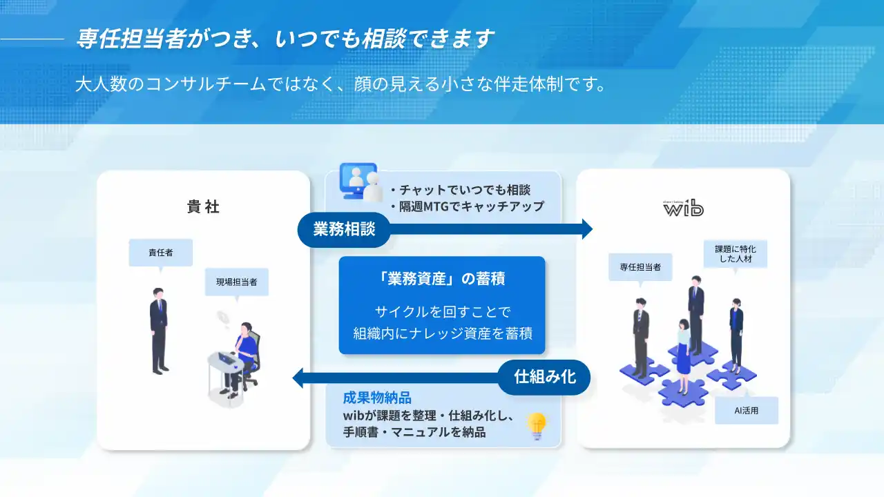 | 今後は、モニター企業への提供を通じてサービスをさらに磨き込みながら、業種や業務テーマごとの知見を蓄積し、より多くの企業が生成AIを現場で無理なく活用できる状態をつくっていきたいと考えています。wibはこれからも、“人に依存しすぎない、再現性のある強い組織づくり”を支援してまいります。 | ||||||||||||||||||