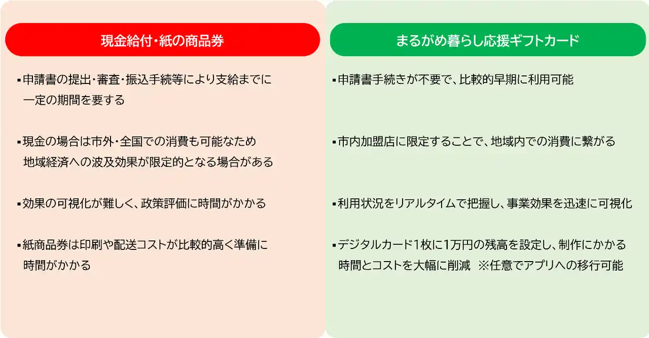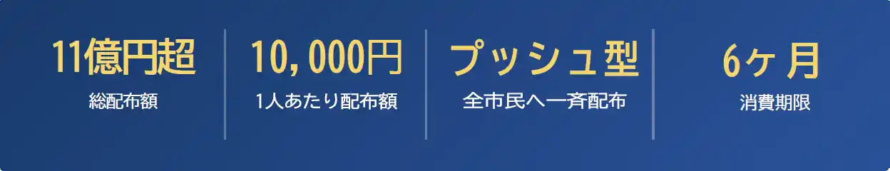 本事業は、市民全員に申請不要で1人あたり10,000円分(総額11億円超)のギフトカードを直接配布する「プッシュ型」経済支援策です。現金給付では一部が貯蓄に回ってしまう課題を克服するため、使用期限(2026年9月30日)と利用先限定(市内加盟店のみ)を組み合わせることで、配布した財源が地域経済へ還流する仕組みとしています。 |