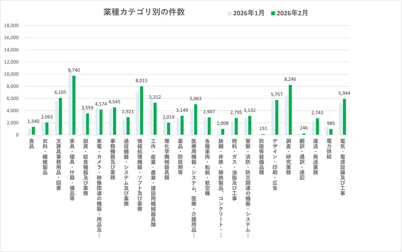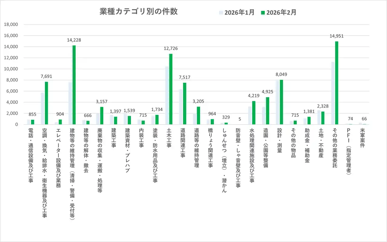 | 2026年2月の業種別入札件数では、多くのカテゴリで前月から増加が見られました。 | |||||||||