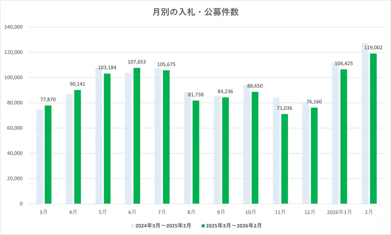 | 2026年2月の入札・公募件数は119,002件でした。前月(2026年1月:106,425件)から12,577件の増加(前月比111.8%)となり、1月に続いて増加しています。年初以降、件数は高水準で推移しています。 | |||||||||