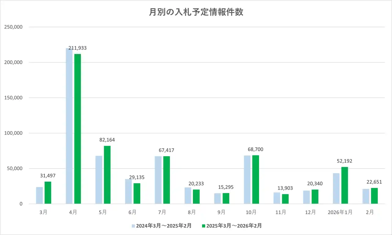 | 2026年2月の入札予定情報件数は22,651件でした。前月(2026年1月:52,192件)から29,541件の減少(前月比43.4%)となりました。一方、前年同月(2025年2月:21,172件)と比較すると1,479件の増加(前年同月比107.0%)となっています。 | |||||||||