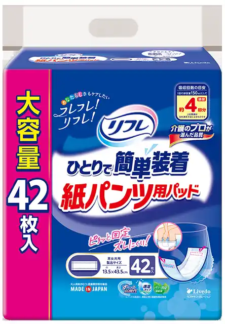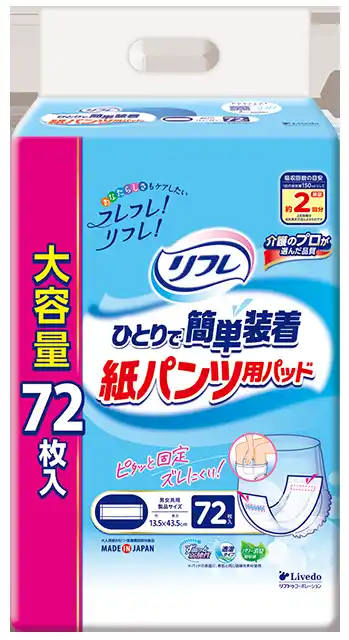 | 「リフレ ひとりで簡単装着紙パンツ用パッド」は、紙パンツにすっきりおさまるサイズ設計により、ご利用者様自身で簡単に装着できるとご好評をいただいております。 | ||||||||