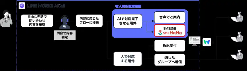 | そこで今回、SMS送信サービス「SMS HaNa」と、電話応対AIサービス「LINE WORKS AiCall」を連携することで、電話対応とメッセージ配信をシームレスに組み合わせた顧客対応フローを実現しました。 | |||