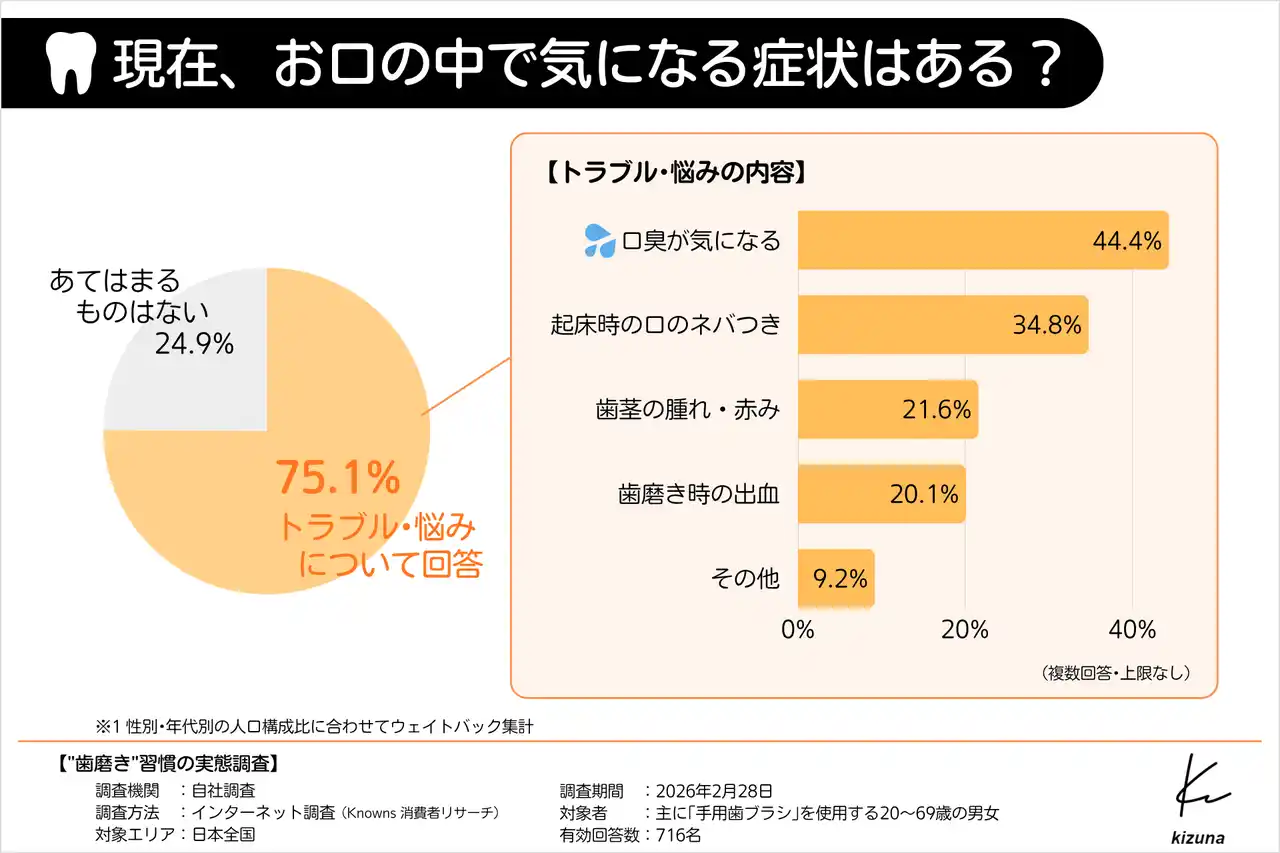 1.75.1%が何らかのお口のトラブルを実感、最多の悩みは「口臭」で44.4% |