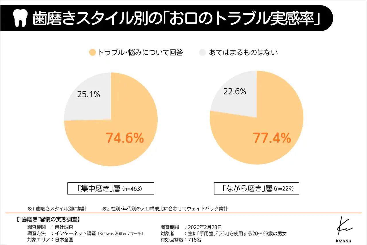 トラブルを感じている割合は、「集中磨き」層で74.6%、「ながら磨き」層で77.4%となり、両者に大きな差は見られませんでした。時間をかけやすい「ながら磨き」であっても実感率がほぼ変わらないことから、単に時間を長くするだけでなく、汚れを確実に落とせるように丁寧に磨くことが重要になると考えられます。 |