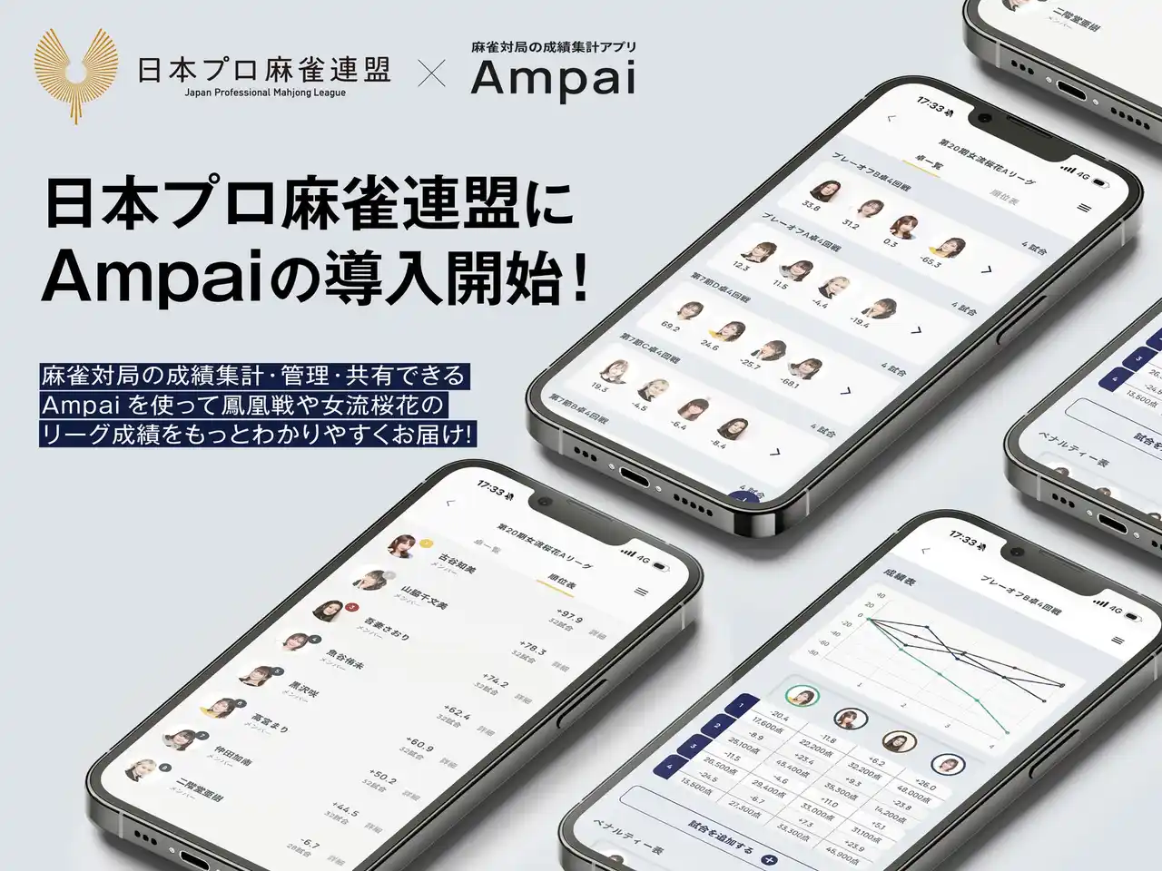 麻雀対局の成績集計アプリ「Ampai」は、このたび日本プロ麻雀連盟の公式成績集計アプリとして導入されることが決定しました。導入対象は「鳳凰戦」「女流桜花」の全リーグです。Ampaiを通じて、成績の集計・管理・共有をよりスムーズにし、選手、運営、ファンの皆さまにとって、より見やすく追いやすい麻雀観戦体験を届けてまいります。 |