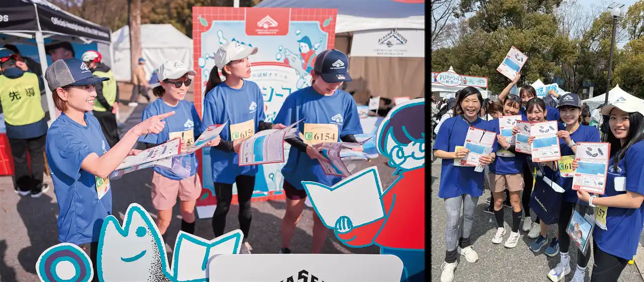 今回の10kmレースには、ランニングコーチの木下裕美子さんをはじめ、計6名のアラスカシーフードPRランナーが出走し、見事全員が完走を果たしました。協会ロゴがデザインされたお揃いのオリジナルTシャツを身に纏い、初春の渋谷・表参道を駆け抜けたランナーたちは、レース終了後もブースに合流。会場には公式キャラクターの「サステナビリー」も登場し、来場者との写真撮影や交流を通じて、ブース一帯は活気あふれる賑わいを見せました。 |