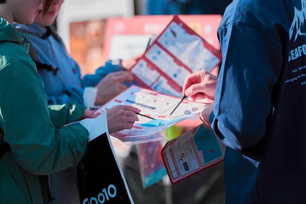 近年注目を集める「リアル謎解きゲーム」が、アラスカシーフードをテーマに登場。来場者が主体的に遊びながら学べる体験型コンテンツとして、高い関心を集めました。手つかずの大自然が広がるアラスカの海を舞台に、参加者は「調査員」となり、魚たちと協力しながら謎を解き明かすミッションに挑戦。参加者からは、「手応えのある難易度で、アラスカシーフードの知識を深められる満足度の高い内容だった」「謎解きを通じて、これまで以上にアラスカシーフードを身近に感じることができた」といった喜びの声が多く寄せられました。 |