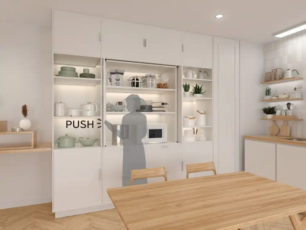 垂直収納扉金物とは、開いた扉をキャビネットへ収納し、扉手前の空間を有効活用できる金物です。プッシュオープン仕様では、扉を押すだけで開閉できる機構を搭載し、ハンドルレスデザインを実現。空間の意匠性向上と操作性を両立し、設計の自由度を広げます。
